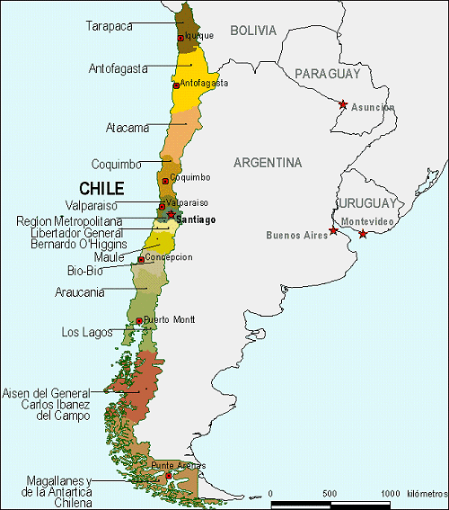 Chile se ubica en américa del sur y su extensión territorial es de 755.838 km2 comprendiendo una larga y estrecha franja llamada chile continental. Mapa de chile, dividido en regiones. Chile ocupa una larga franja de tierra en el suroeste del continente. Mapa de chile por regiones.